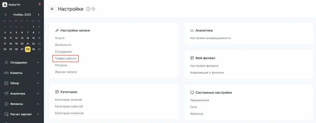 1. Перейдите в раздел «Настройки» > блок «Настройки записи» > «График работы».