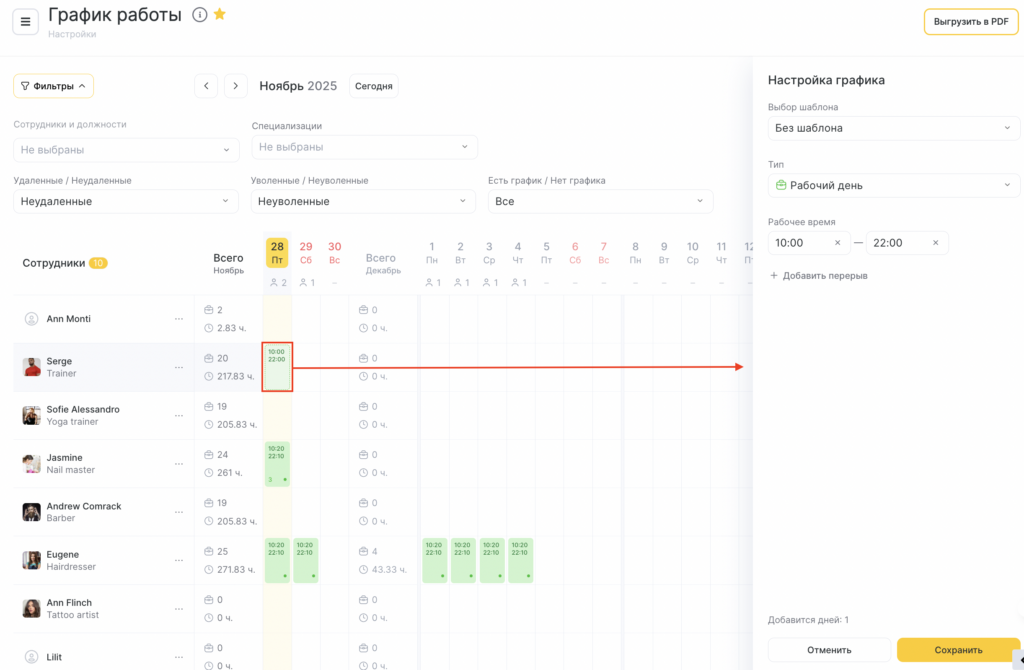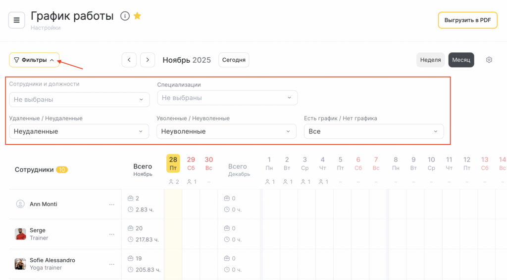 Настроенный график работы можно выгрузить в PDF-файл с помощью кнопки «Выгрузить в PDF» в правом верхнем углу и после сохранить на ваше устройство или распечатать. Выгрузка графика доступна как по всем сотрудникам, так и по отфильтрованным сотрудникам — в этом случае в выгрузку попадут все сотрудники, отобразившиеся после применения фильтров.