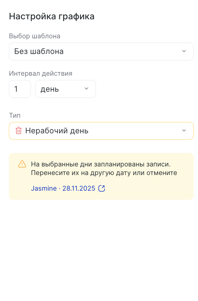 4. Можно также удалять рабочий день с записями. При удалении будет показан баннер, который предупреждает о записях и говорит, где их можно посмотреть и перенести.