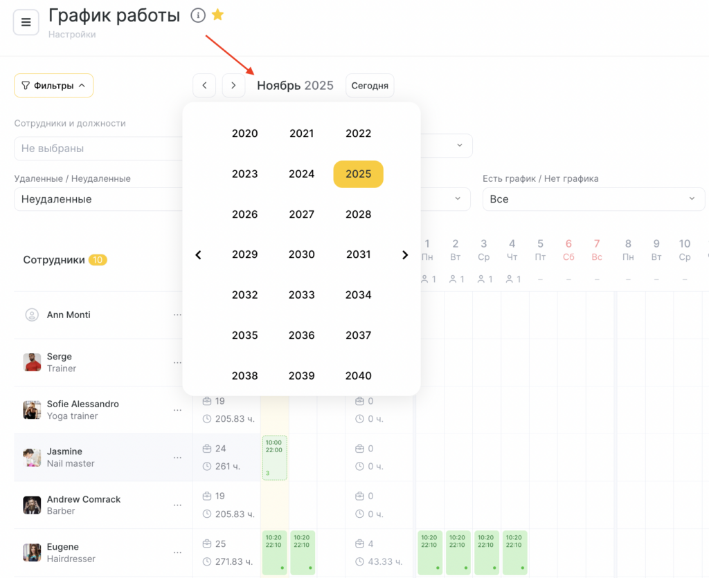 Перед настройкой графика работы сотрудников при необходимости вы можете отфильтровать сотрудников и настроить отображение ячеек графика по месяцам или неделям с суммой смен и часов и количеством сотрудников за день.