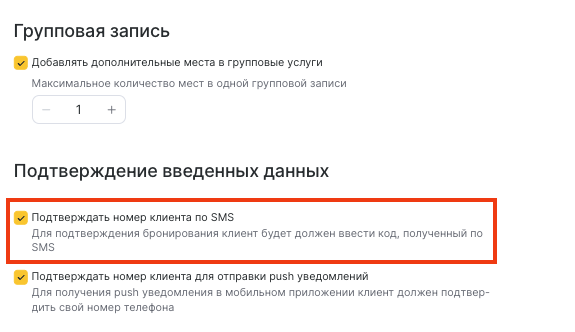 В разделе Онлайн-запись > Настройки > Измените экран ввода данных клиентов поставьте галочку Подтверждать номер клиента по SMS, если хотите, чтобы клиент смог завершить запись только после подтверждения своего номера. Данная функция позволит избежать создания недействительных и тестовых записей.