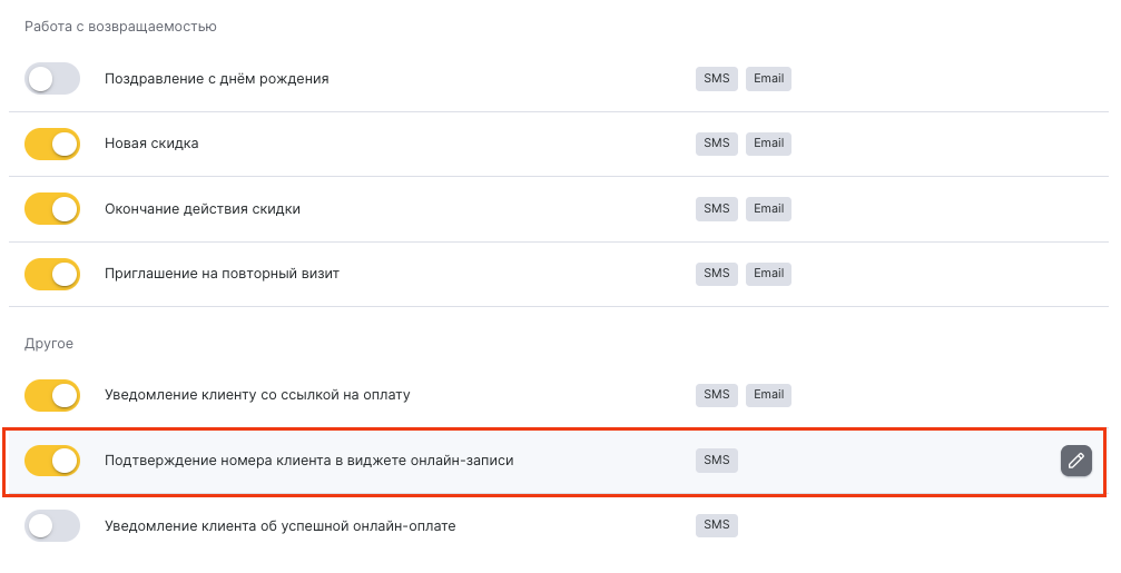- В блоке Уведомления клиенту выберите тип Подтверждение номера клиента в виджете онлайн-записи и нажмите на кнопку Изменить с изображением карандаша.