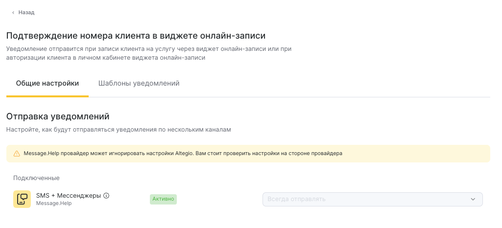 Обязательно проконсультируйтесь с вашим агрегатором об особенностях отправки кодов подтверждений. У разных провайдеров — разные условия. Для некоторых операторов связи, с которыми работают провайдеры, не подходит стандартный шаблон от Altegio только с кодом. В этом случае вы можете настроить другой шаблон, где будет указано также название вашей компании.