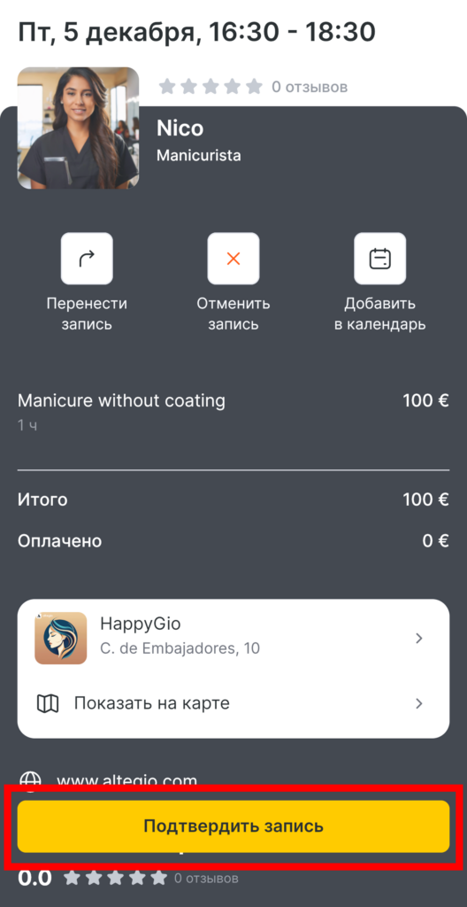 После того как сообщение было отправлено, на странице с деталями записи появится кнопка Подтвердить запись.