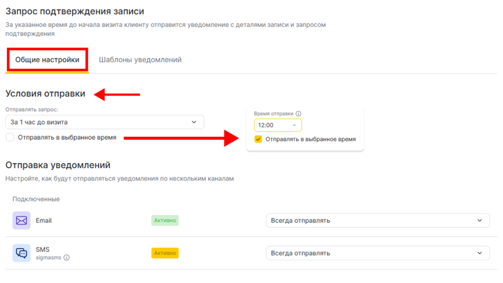 - На вкладке Общие настройки выберите условия отправки. Вы можете выбрать отправку уведомления за определенное время до визита или выбрать конкретное время. Подробнее о сценариях отправки уведомлений по разным каналам читайте в статье.