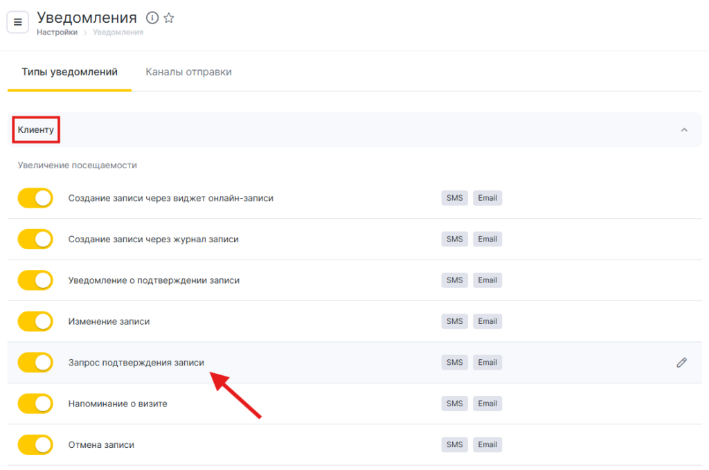 - В блоке Клиенту выберите тип Запрос подтверждения записи клиентом, нажав на название уведомления или иконку карандаша.