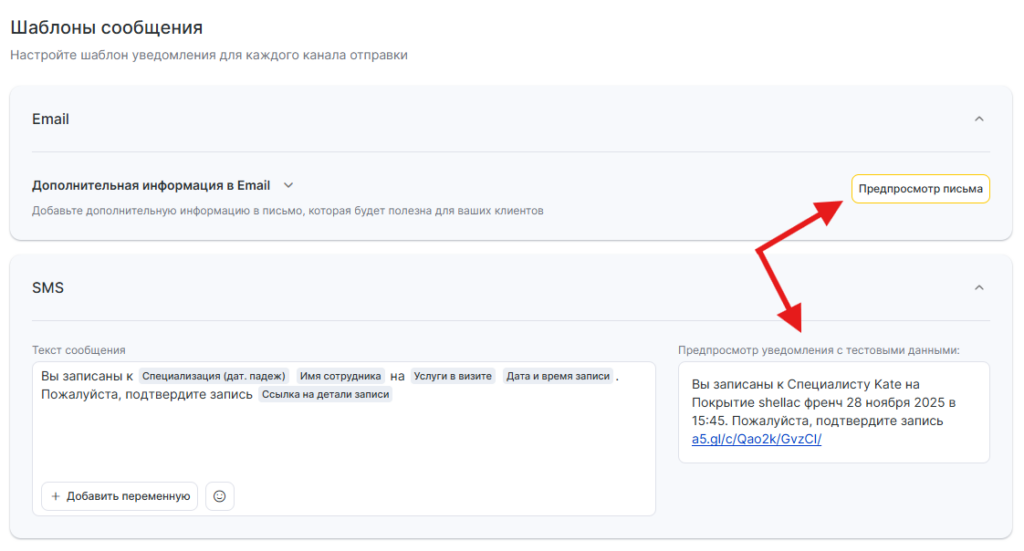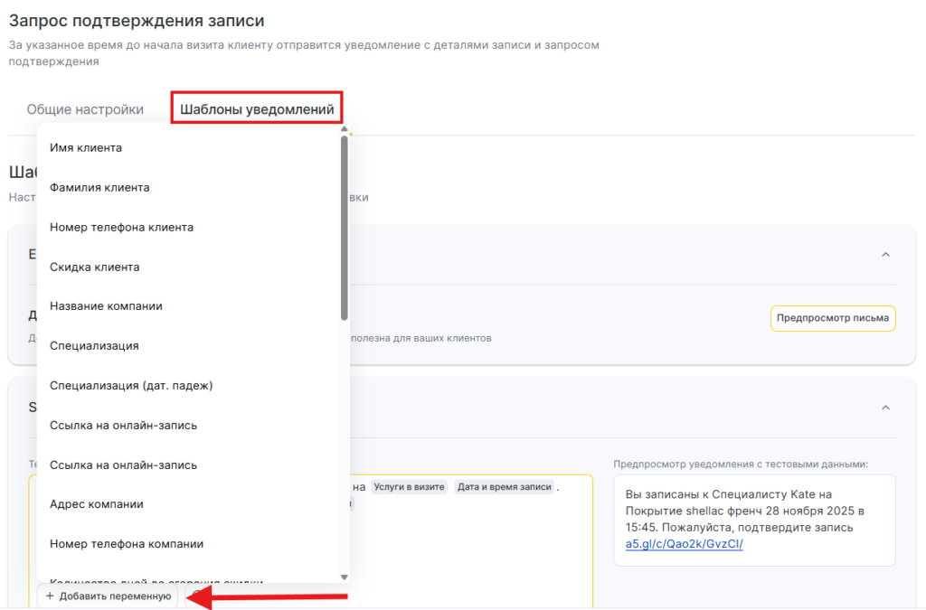 Для всех шаблонов уведомлений доступен предпросмотр — как будет выглядеть сообщение при отправке клиенту, сотруднику или администратору, с учетом переменных.