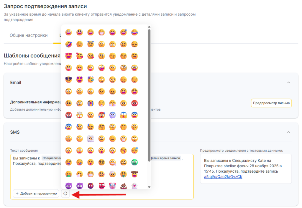 - В SMS-шаблонах уведомлений вы можете использовать Emoji смайлы, для этого нажмите на кнопку со смайлом и выберете нужный из предложенных или добавьте свой.
