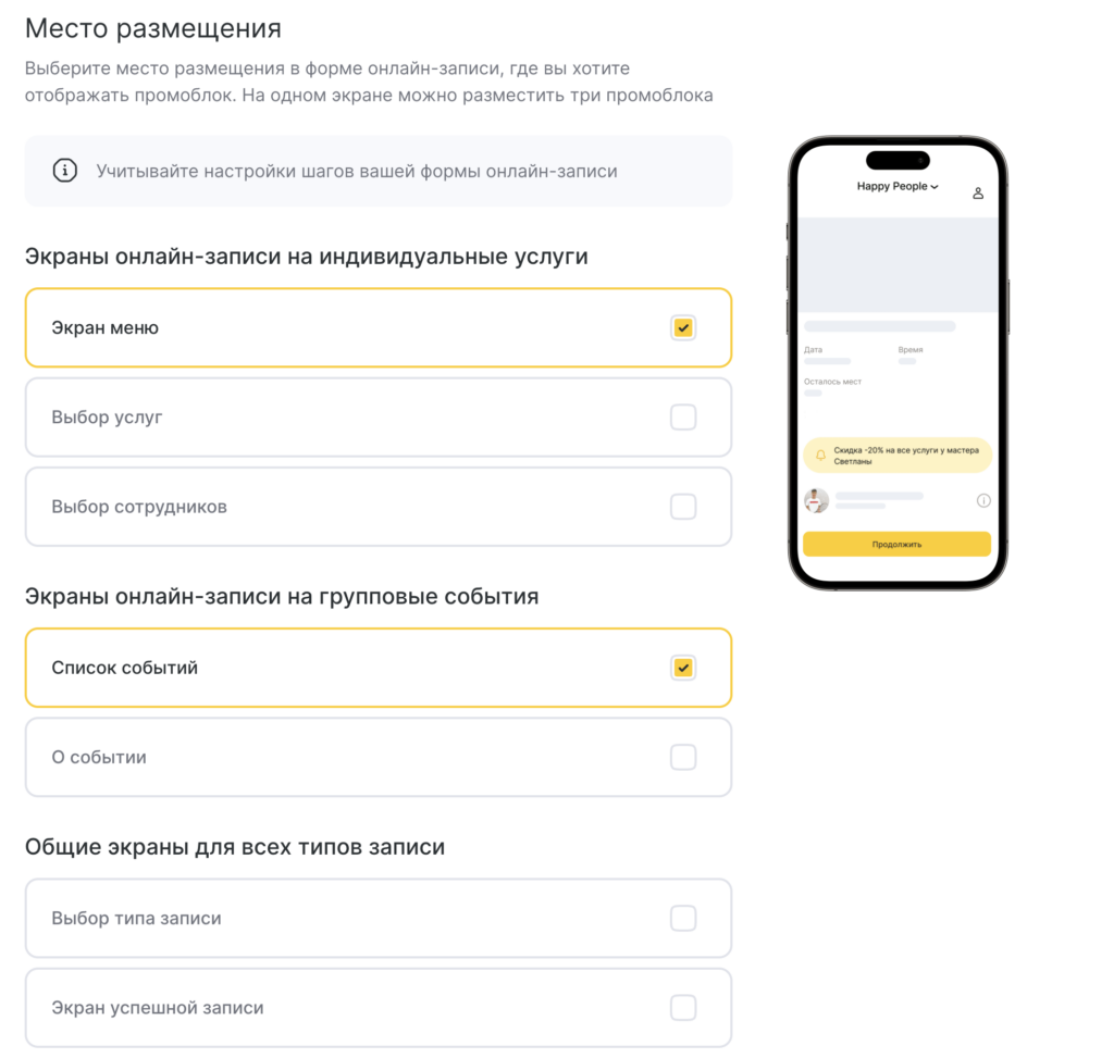 - Выберите место размещения в форме онлайн-записи, где вы хотите отображать промоблок: экран меню, выбор услуг, выбор сотрудников, экран успешной записи. Можно выбрать как одно место, так и все одновременно. Если вы создадите несколько промоблоков, то на одном экране будет отображаться только один промоблок.