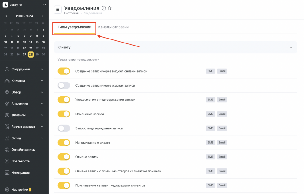 В системе Altegio вы можете настроить различные сценарии отправки для типов уведомлений и задать последовательность отправки сообщений в зависимости от канала — email, push в мобильные приложения (Altegio.me, брендированное приложение, приложение администратора) и SMS.