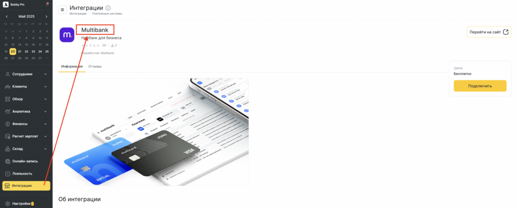 Вы будете перенаправлены сайт multibank.uz , где вы сможете заполнить заявку и завершить интеграцию. После этого с вами свяжется менеджер для дальнейших инструкций.