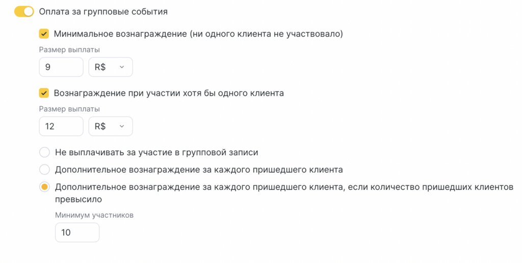 Пример: Сотрудник получает 50% от стоимости услуги, если пришёл хотя бы 1 клиент (процент не умножается на количество участников).