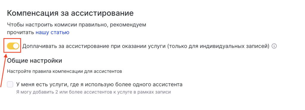 Включите опцию «Доплачивать за ассистирование при оказании услуги»