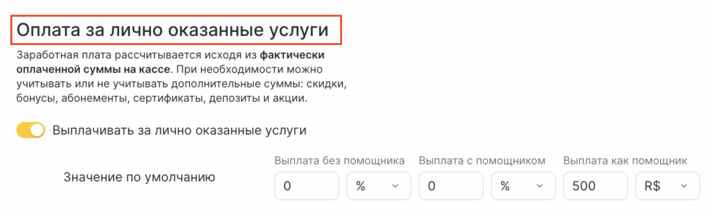 Включите опцию «Выплачивать за лично оказанные услуги», если вы хотите, чтобы сотрудник получал компенсацию за участие в оказании услуг.