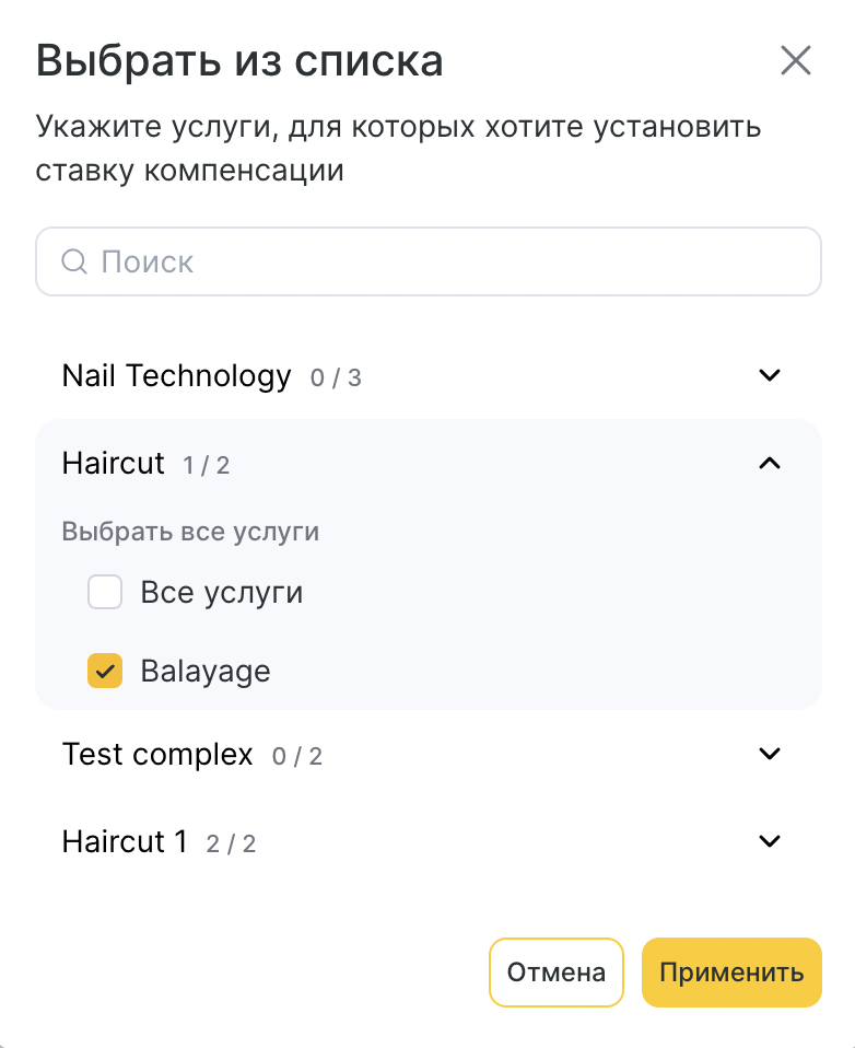 Далее выберите услуги и/или категории услуг из списка: