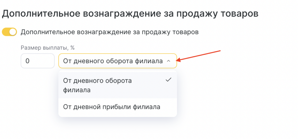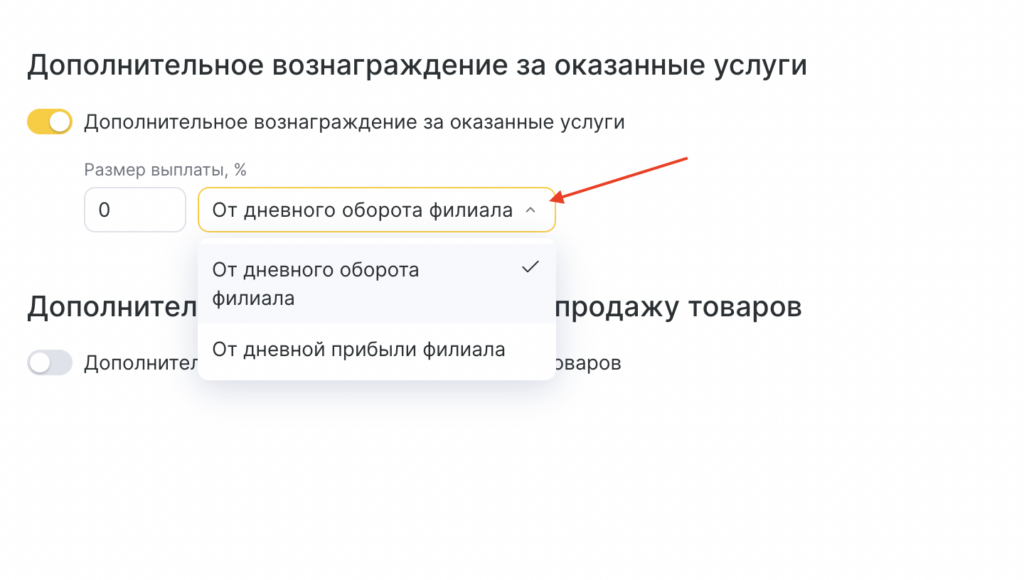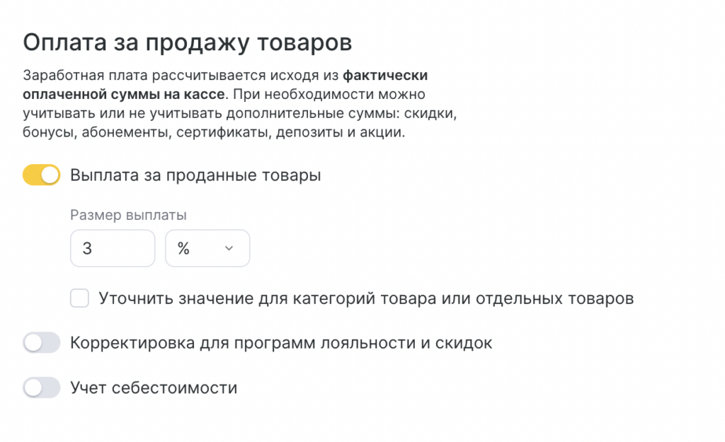 Активируйте “Выплата за проданные товары”, если сотрудники получают комиссию с продаж розничных товаров.