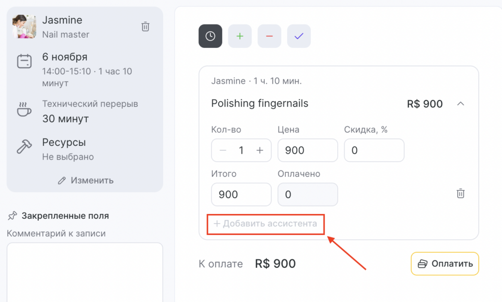 Во время создания записи или при оказании услуги вы можете добавить ассистентов. Для этого: