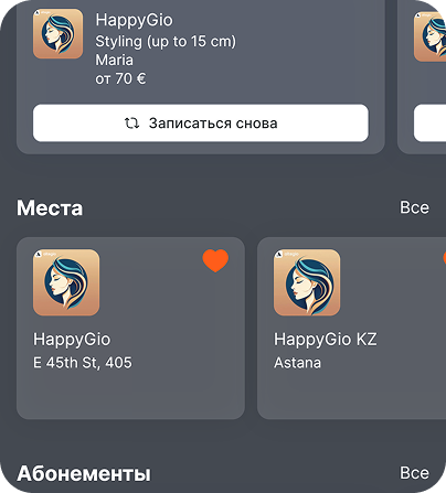 - Перейти к блоку Места на главной странице приложения. В блоке Места отображаются все компании, куда когда-либо записывался посетитель на номер, по которому авторизован в приложении. Карточки компаний располагаются в виде карусели, ее можно листать, также можно перейти к странице со всеми компаниями через кнопку Все.