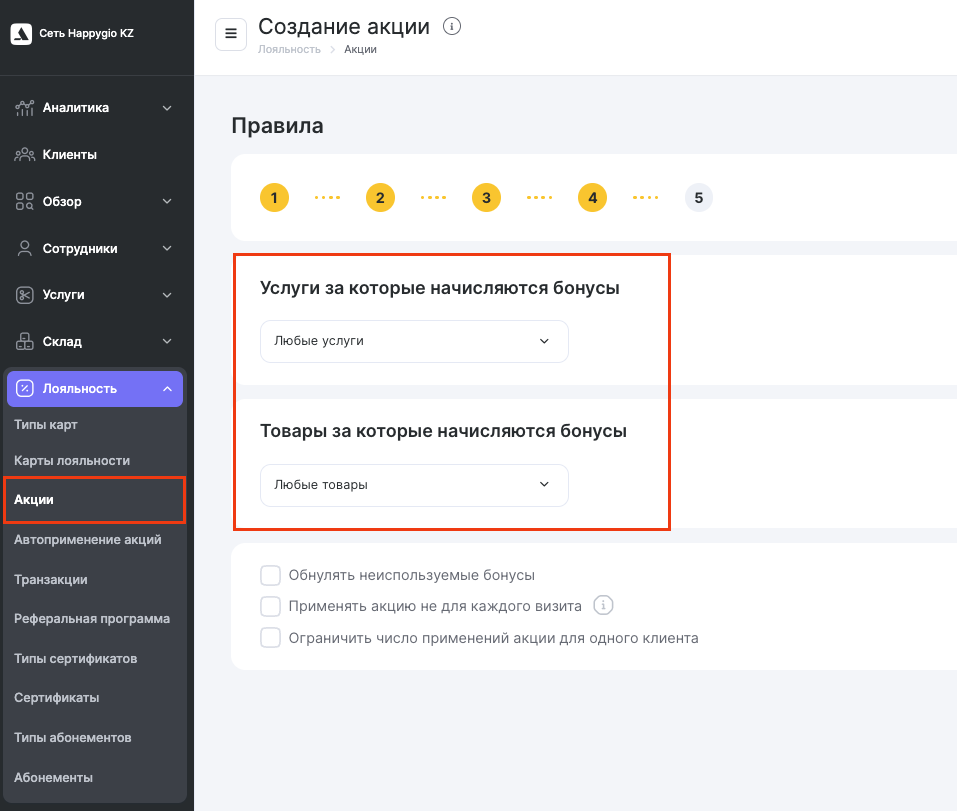 Ограничения на начисления кэшбэка указываются при создании акции в сетевом разделе Лояльность > Акции.