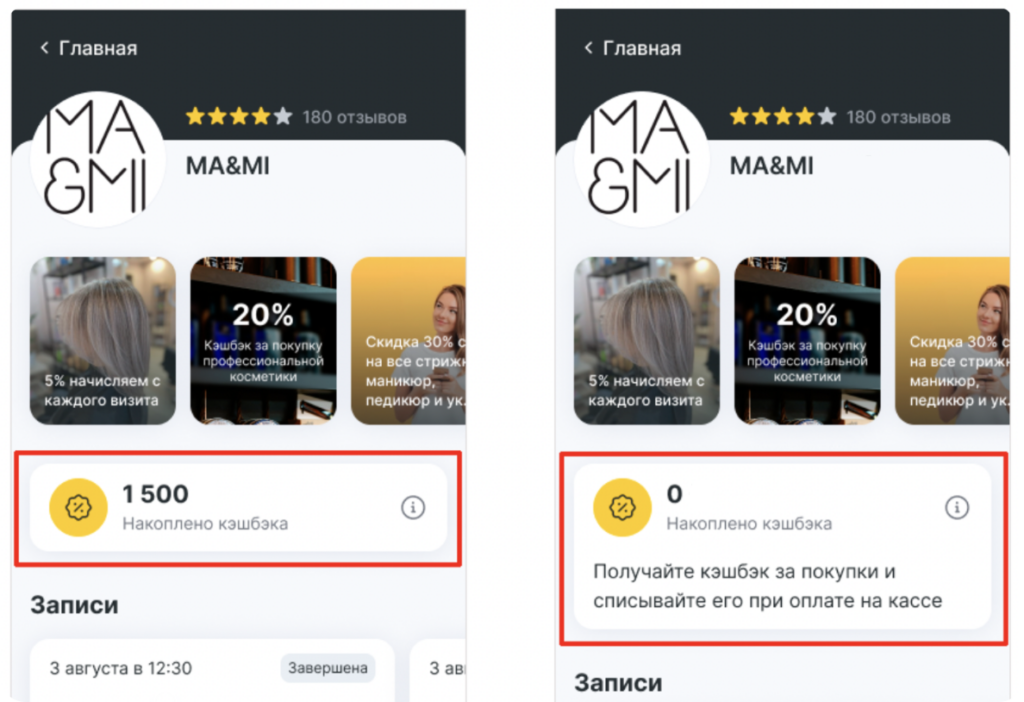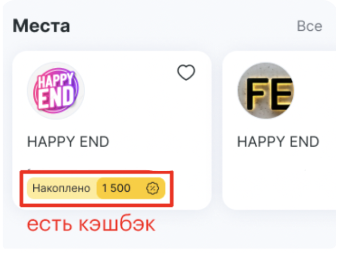 Если у клиента нет накопленного кэшбэка или в филиале не действуют бонусные программы, то в карточке компании на главной странице кэшбэк или его упоминания отображаться не будут.