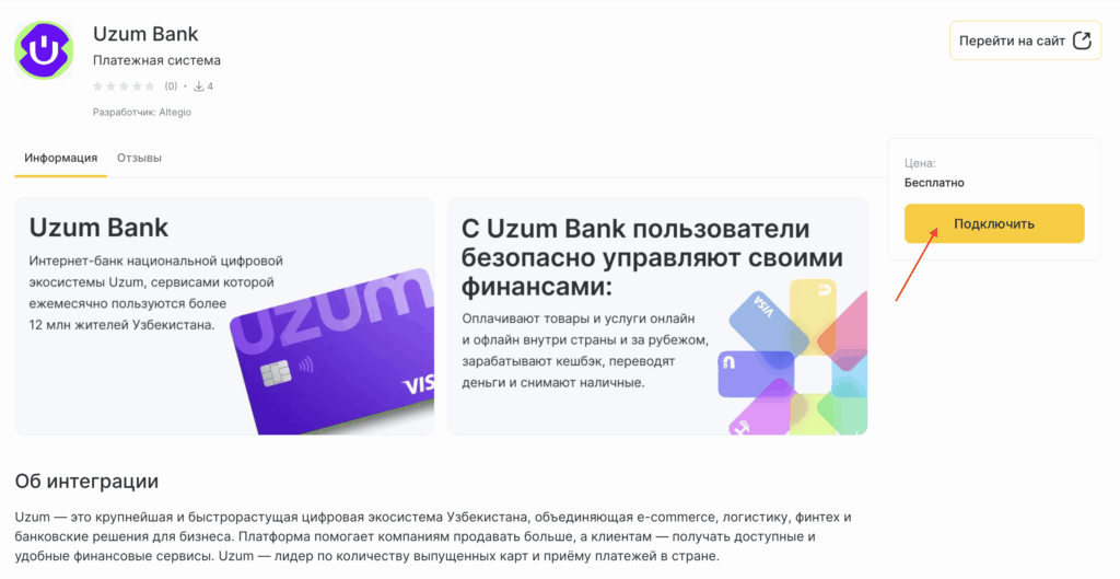 Получите ключи интеграции на email. После этого откройте в Altegio раздел «Интеграции», найдите Uzum Bank и нажмите «Подключить».