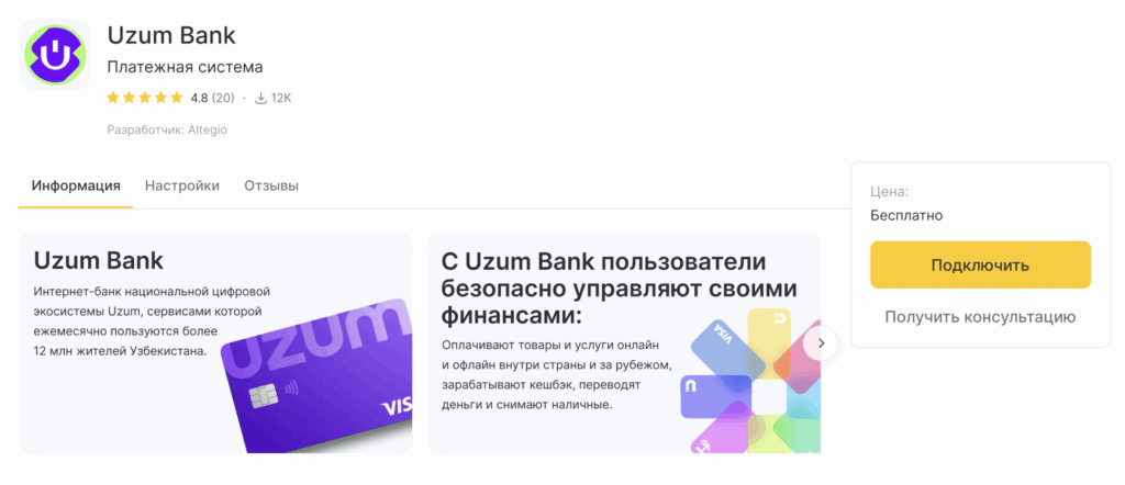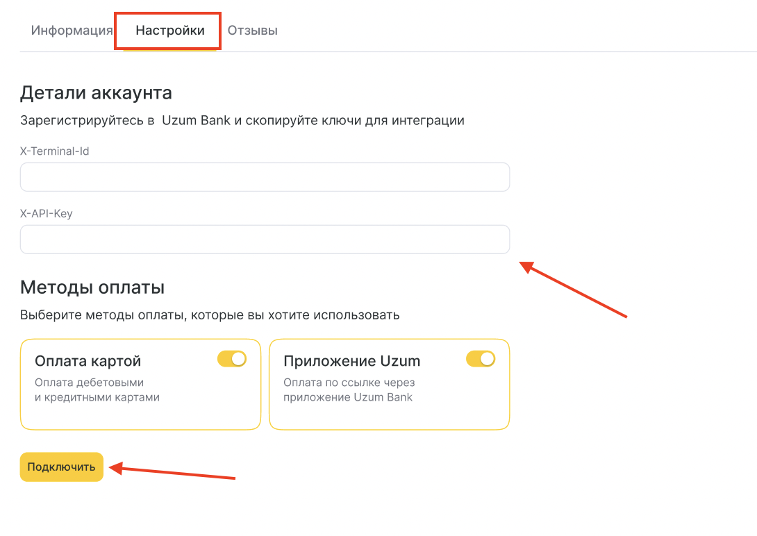 После сохранения данных интеграция активируется, и клиенты смогут оплачивать услуги через Uzum Bank.