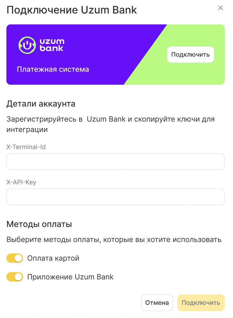 После получения ключей интеграции от Uzum Bank настройте подключение в Altegio. Откройте раздел Интеграции → Uzum Bank. Нажмите на кнопку Подключить. В появившемся окне введите выданные банком доступы:
