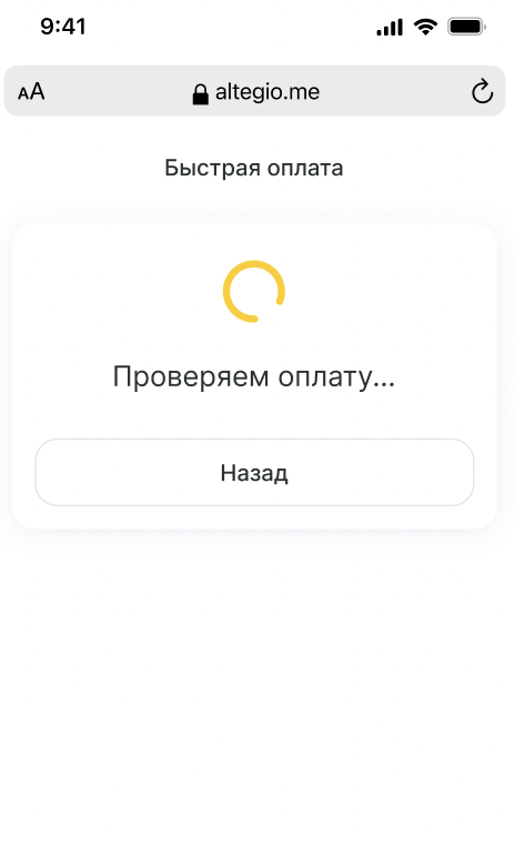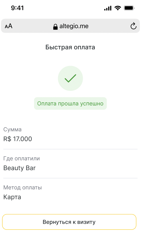 После успешной транзакции Altegio отображает экран с сообщением «Оплата прошла успешно».