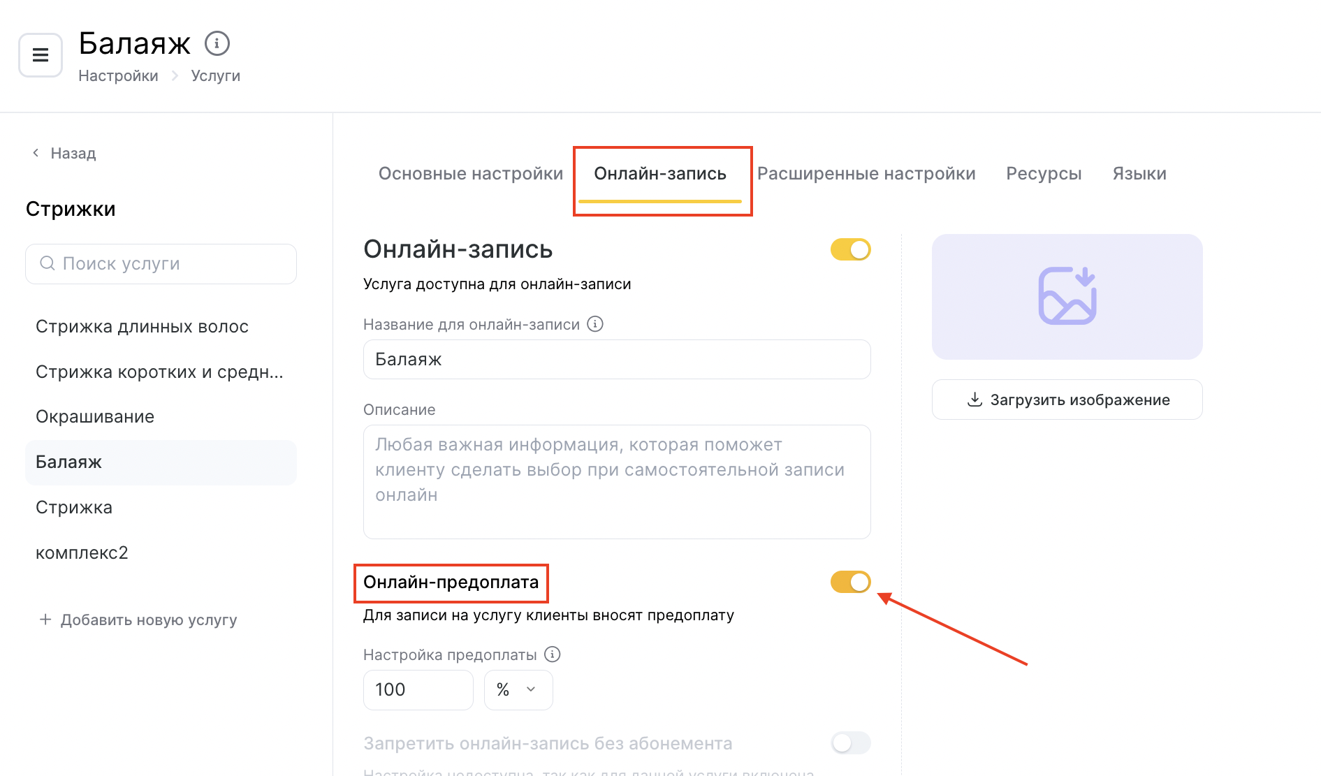 - Перейдите на вкладку Онлайн-запись в настройках услуги и включите онлайн-предоплату.
