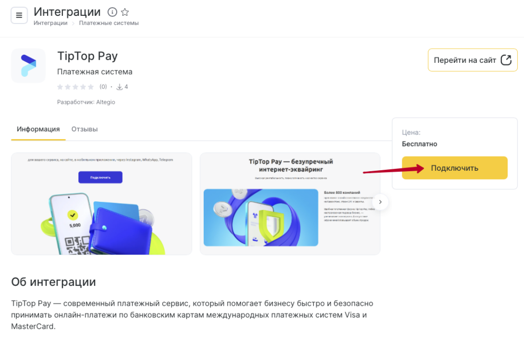 Левая панель → Интеграции → Маркетплейс → Платежные системы → TipTop Pay