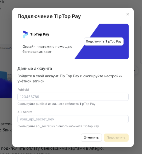 После этого вернитесь в Altegio и укажите Public ID и API Secret в окне настройки интеграции TipTop Pay.