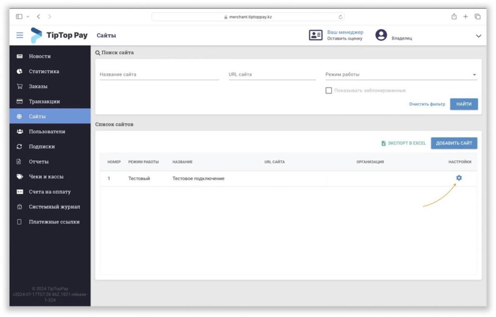 В личном кабинете TipTop Pay откройте раздел «Сайты». Найдите сайт, который вы используете для приема платежей. Нажмите на него, чтобы перейти в настройки.