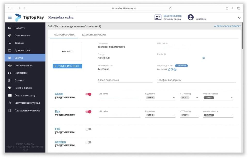 Для корректной работы интеграции в TipTop Pay должны быть активированы следующие типы уведомлений: