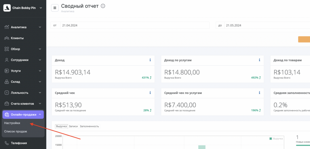 Чтобы подключить способ оплаты AltPay к системе Altegio, перейдите в интерфейс сети, в разделе «Онлайн-продажи» выберите «Настройки».