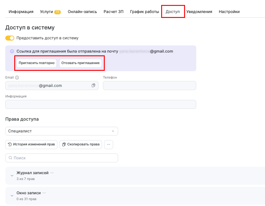 Если вы указали неверный адрес электронной почты или номер телефона, либо предоставили доступ не тому сотруднику, вы можете отменить отправленное приглашение, нажав кнопку Отозвать приглашение.