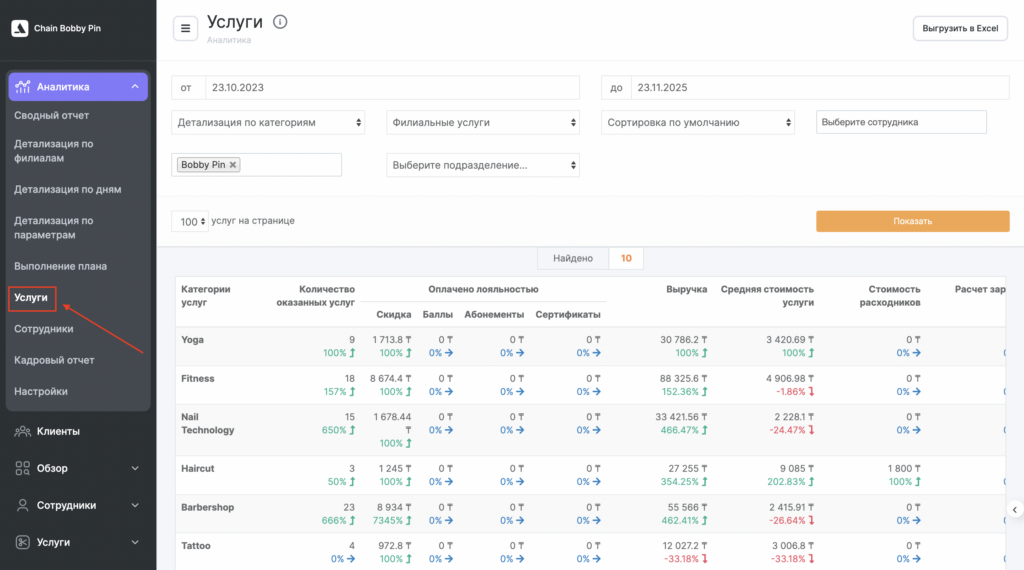 Раздел «Услуги» предоставляет детальную аналитику по оказанным услугам за выбранный период. Здесь можно изучить популярность различных категорий услуг, выручку, прибыль, затраты, среднюю стоимость, количество оказаний, а также показатели лояльности и работу сотрудников.