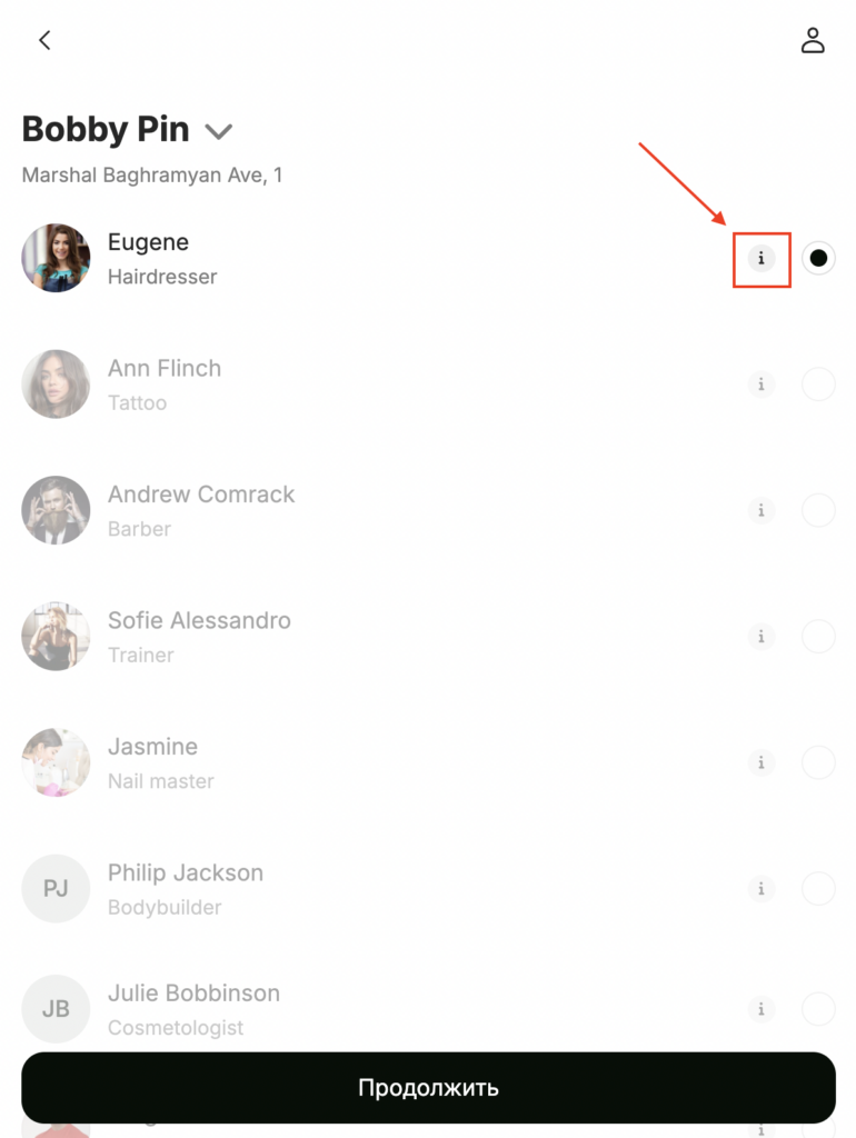 Описание открывается в виджете онлайн-записи по нажатию на значок i рядом с фото. В этом блоке обычно указывают профессиональный опыт, образование, список услуг, специализацию и краткие личные данные.