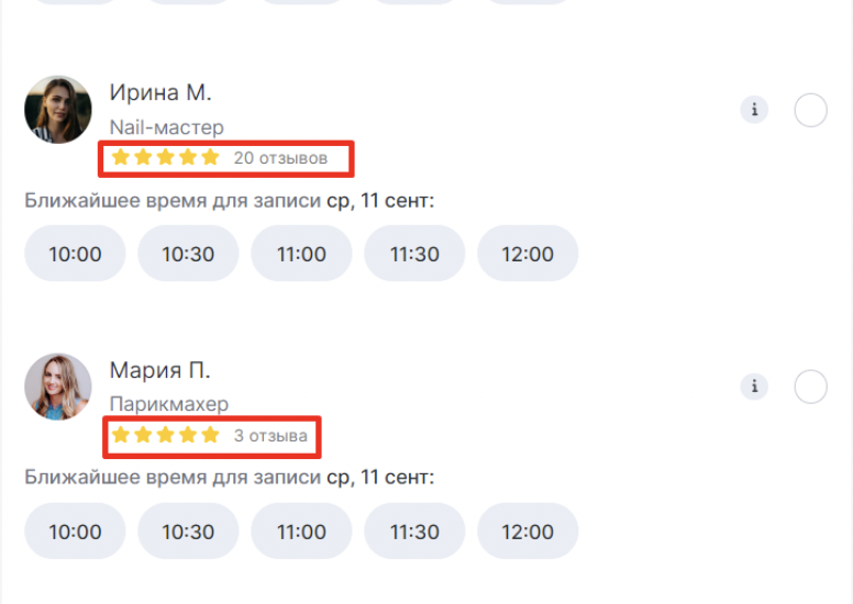 Если поставить галочку Рейтинг сотрудника, клиенты смогут видеть оценки и количество отзывов о сотруднике в виджете онлайн-записи.