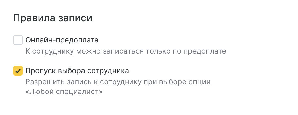 Пропуск выбора сотрудника — поставьте галочку, чтобы разрешить запись к сотруднику при выборе опции клиентом Любой специалист. Включение пропуска выбора в настройках сотрудника позволяет клиентам выбирать любого из сотрудников, если для них настроена эта опция, а также если включен сам выбор любого сотрудника.
