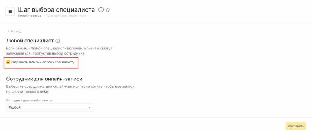 Включение/выключение кнопки выбора любого специалиста для всех виджетов настраивается в разделе Онлайн-запись > Общие настройки > Шаг выбора сотрудника, настройка Разрешить запись к любому специалисту. Подробнее о дополнительных настройках онлайн-записи читайте здесь.
