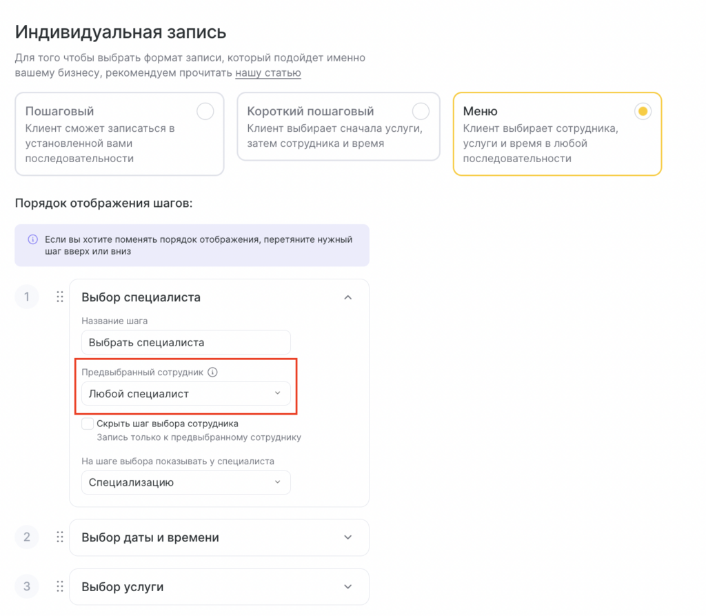 Этот же режим можно включить при настройке шагов записи отдельно в виджете (задать значение Любой специалист в поле Предвыбранный сотрудник, подробнее об этих настройках читайте в статье).