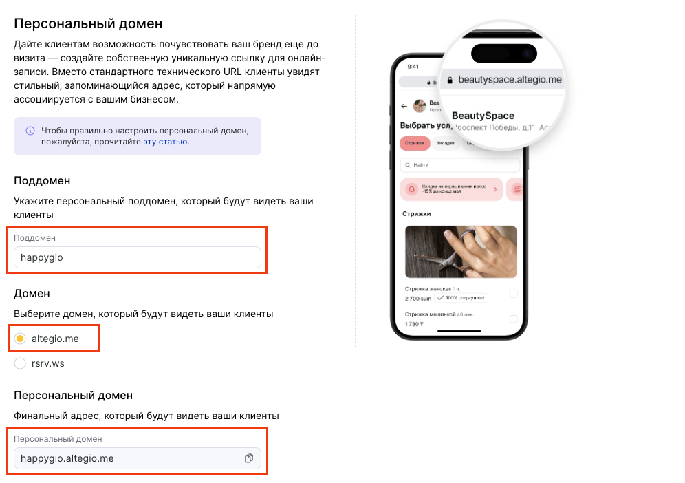 В поле Персональный домен отображается финальный вид домена, который увидят клиенты.
