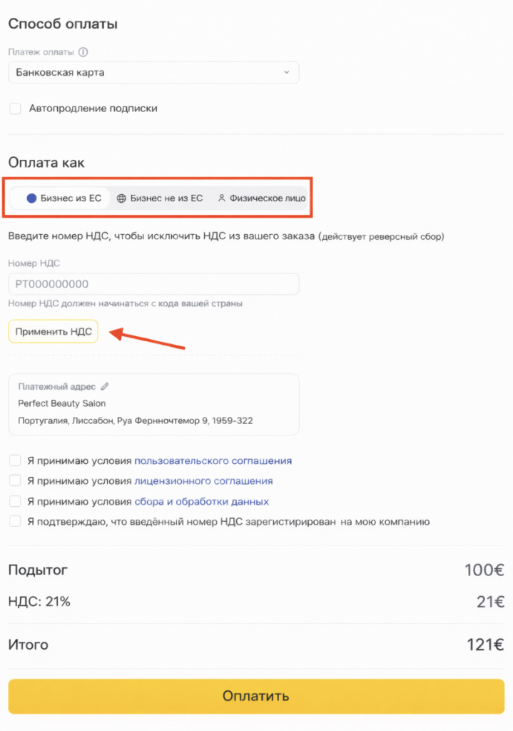 Правила НДС в ЕС зависят от местоположения вашей компании, страны получателя платежа и наличия действующего зарегистрированного НДС номера. Чтобы правильно рассчитать итоговую стоимость, Altegio должен подтвердить, что НДС номер действителен и принадлежит вашей компании.