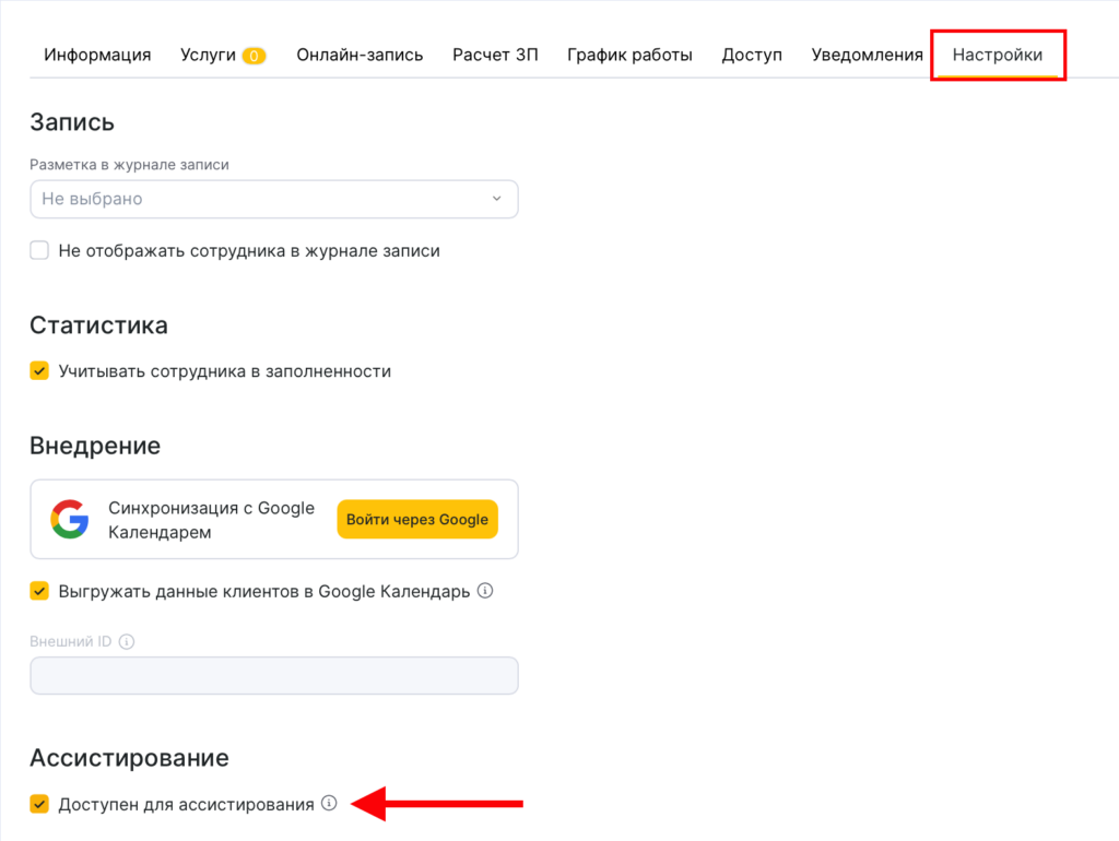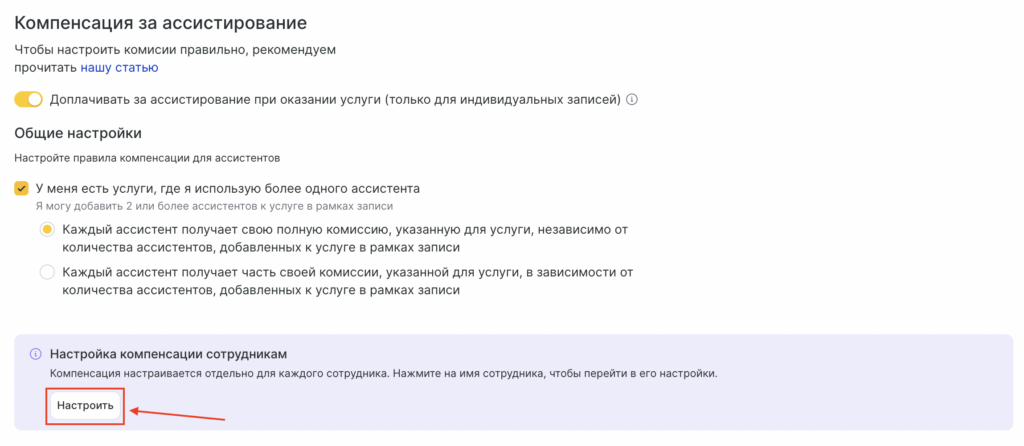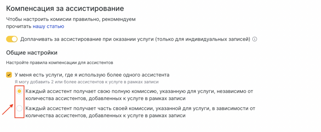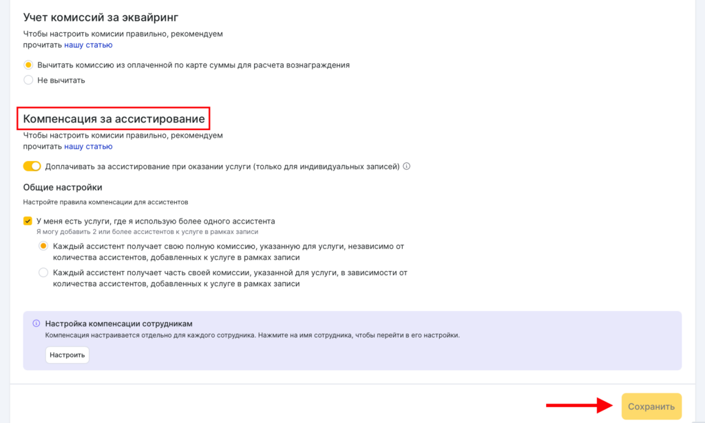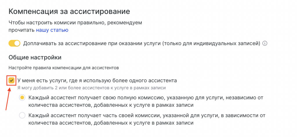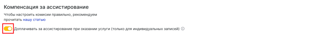 - Включите Доплачивать за ассистирование при оказании услуги (только для индивидуальных записей)