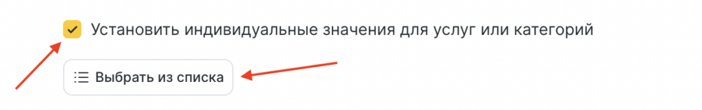 Чтобы назначить отдельное значение для всей категории услуг, нажмите Выбрать из списка, затем выберите нужную категорию и поставьте галочку Все услуги. После этого появится поле, в котором можно указать процент или фиксированную сумму — это значение будет применяться ко всем услугам внутри выбранной категории.