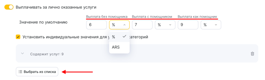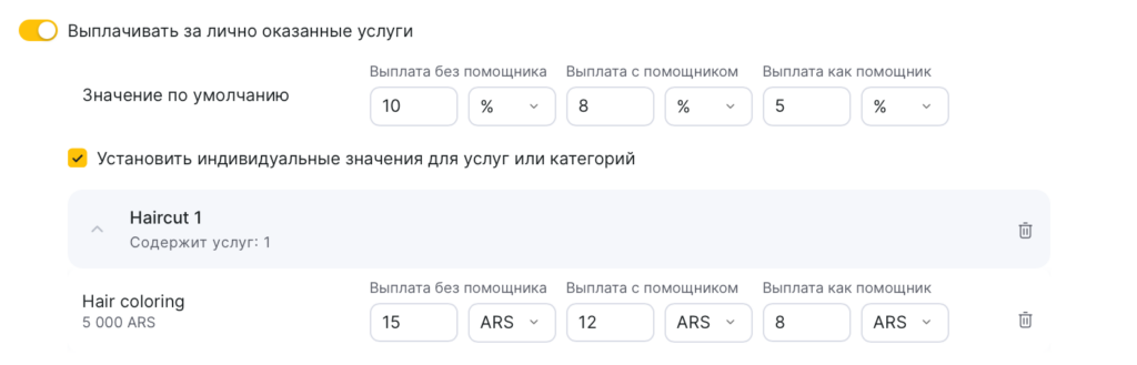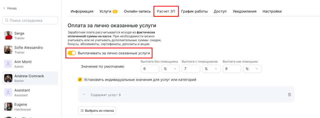 - Если за выполнение отдельных услуг сотруднику нужно назначить иной процент, включите опцию Установить индивидуальные значения для услуг или категорий.