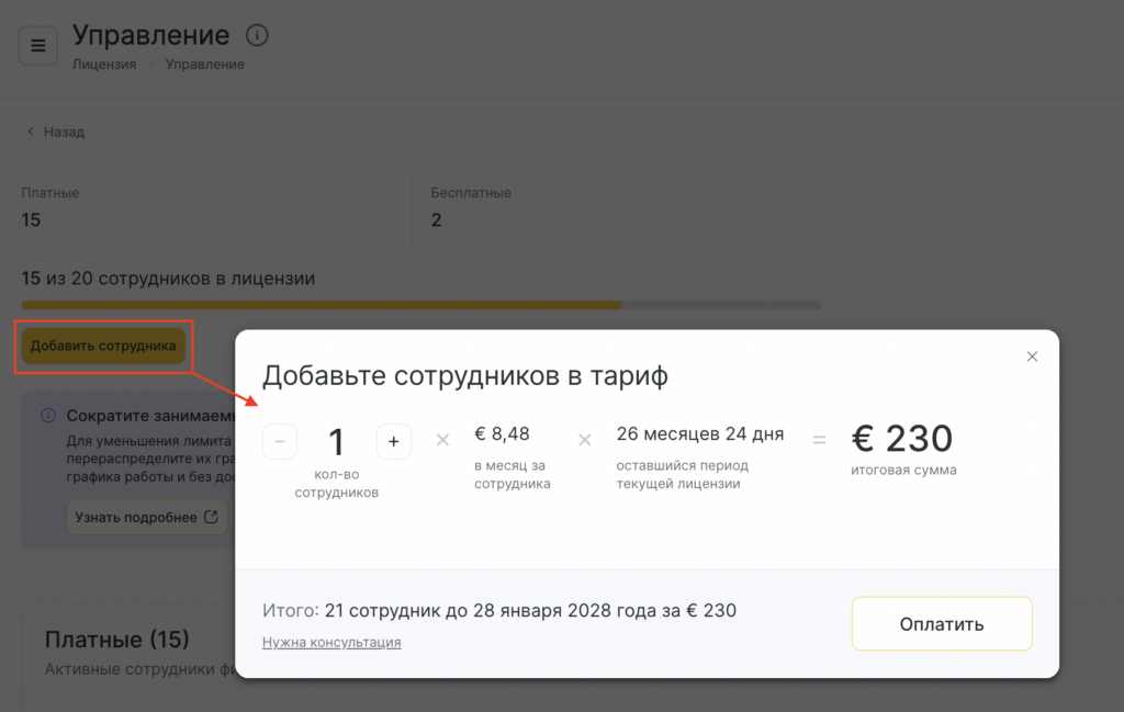 Стоимость докупки сотрудника рассчитывается автоматически на основе последней приобретенной лицензии — без учета предыдущих лицензий и их бонусных месяцев.