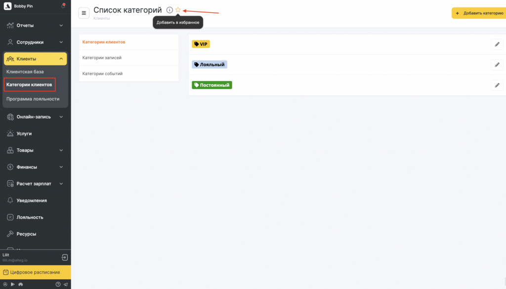 - Категории клиентов — группы клиентов (VIP, новые, постоянные и т. д.).
