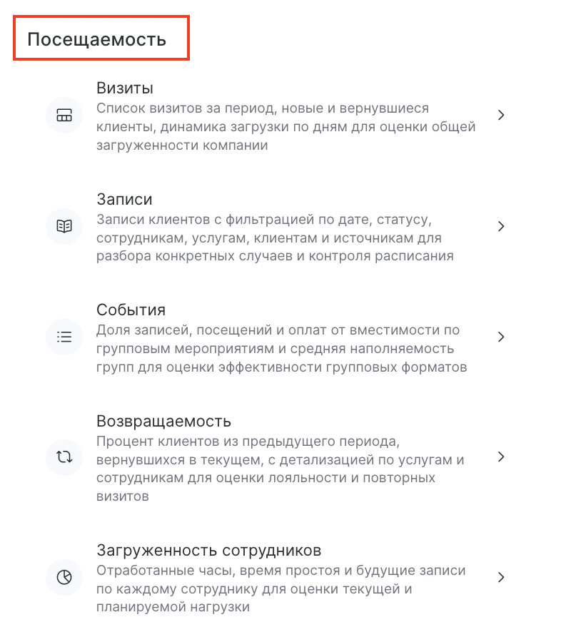 - Визиты — просматривайте список визитов за период, новых и вернувшихся клиентов, а также динамику загрузки по дням для оценки общей загруженности компании. Подробнее — в этой статье.