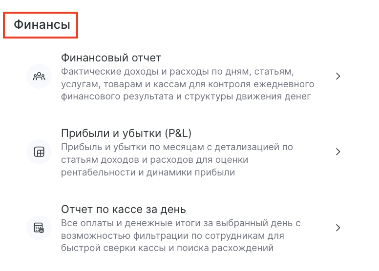 - Финансовый отчет — просматривайте доходы и расходы с разбивкой по дням, категориям, услугам, товарам и кассам. Подробнее — в статье.